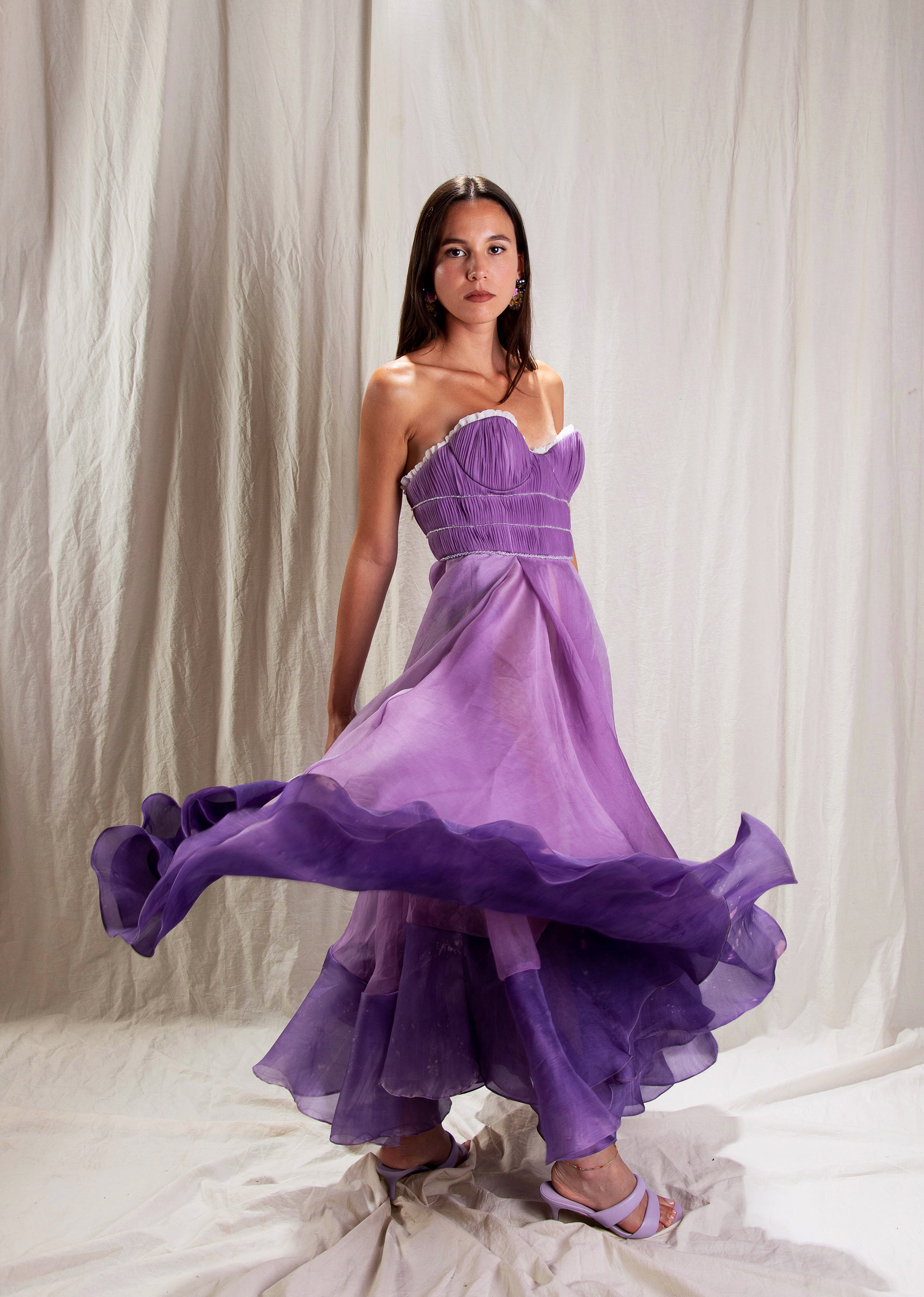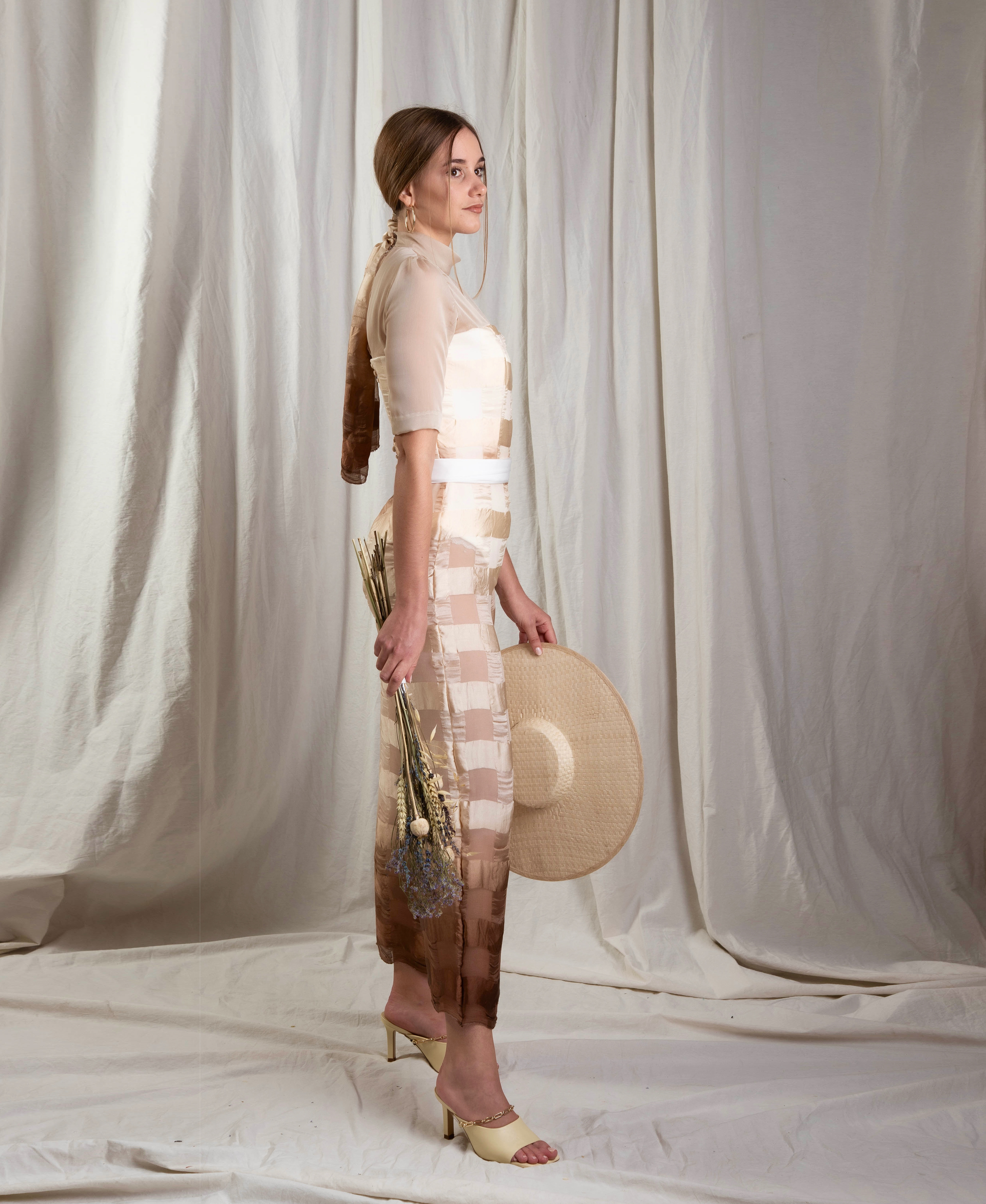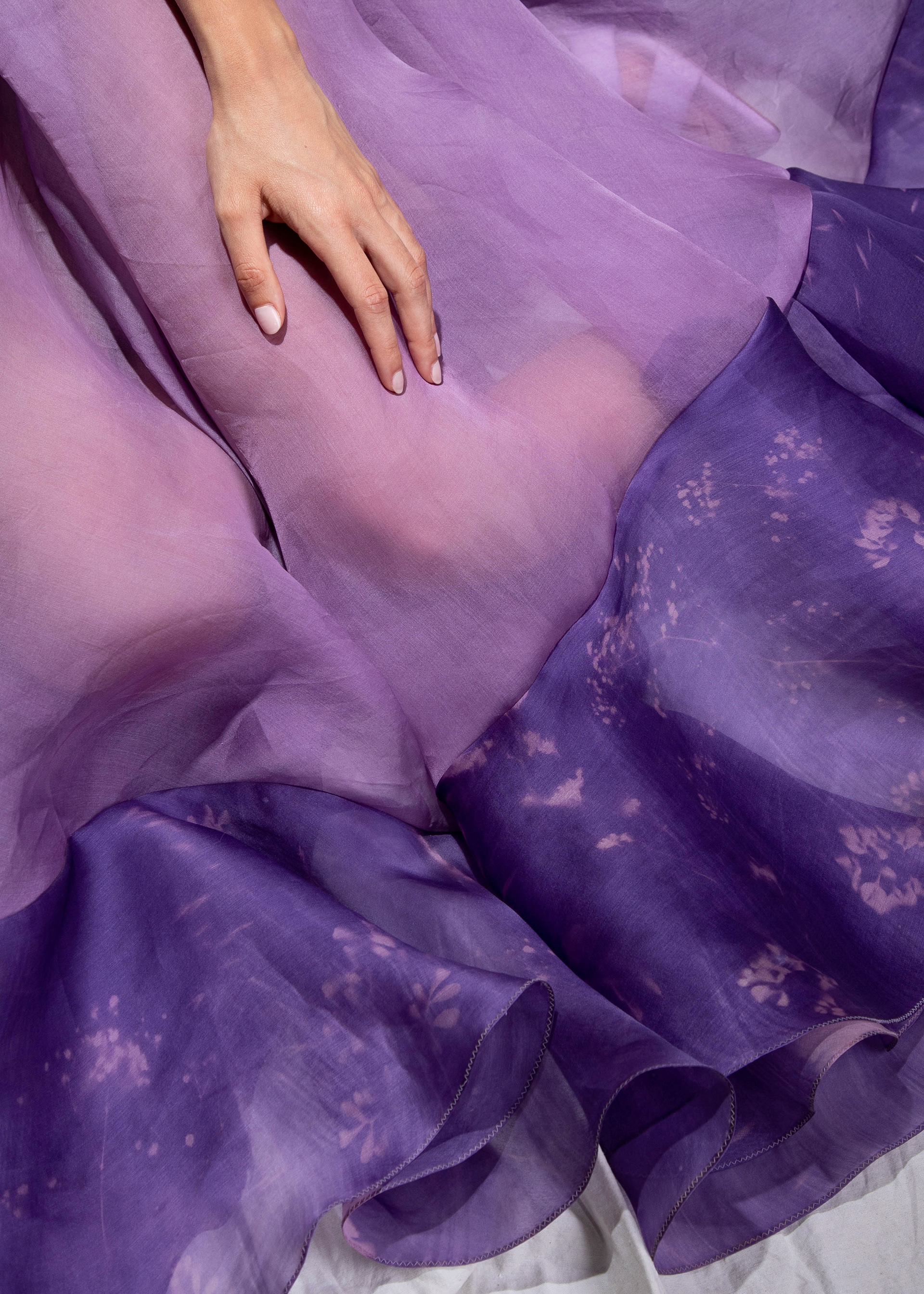Estos mismos cambios se han querido también expresar en la colección, en su variación de colores, de cortes, y sobre todo, en sus técnicas. La familia 1 se caracteriza por la técnica de la cianotipia, donde dejará un estampado con reserva de blancos con la silueta de las flores que se han usado en el proceso. En la familia 2 se hace uso de degradados, al igual que los que vemos en el cielo. En la familia 3 se realizan estampados mediante Bundle Dying, prensando e hirviendo flores y hojas sobre la tela, reflejando así los contrastes de este período. En la familia 4, con el golden hour vemos de nuevo el uso de degradados, entonos dorados, al igual que en la familia 5, donde vemos una gradación del golden hour a la oscuridad.